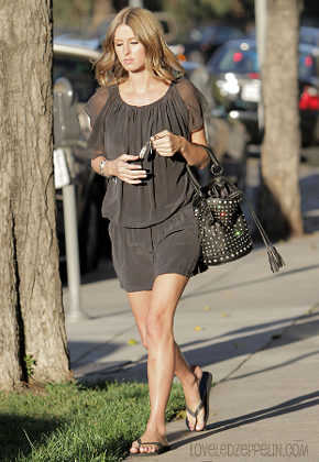 Mischa Barton en un look más otoñal, ha decidido poner el punto femenino-fashion a su atuendo con unos botines peep-toe en cuero negro, llenos de tachuelas doradas.